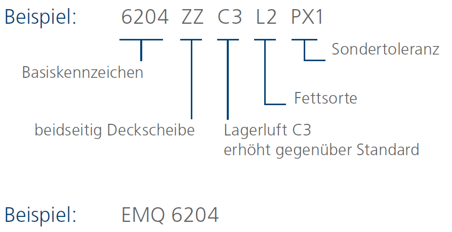 Die vollständige Lagerbezeichnung setzt sich zusammen aus Vorsetzzeichen, Basiskennzeichen und Nachsetzzeichen. Vorsetzzeichen sind im allgemeinen Hinweise auf Sonderausführungen.