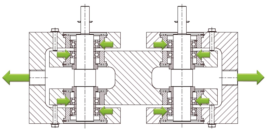 Durch das Aufbringen einer Zugbelastung zwischen den zwei U-Profilen erfolgt eine gleichmäßige Kraftübertragung durch alle acht Lager.