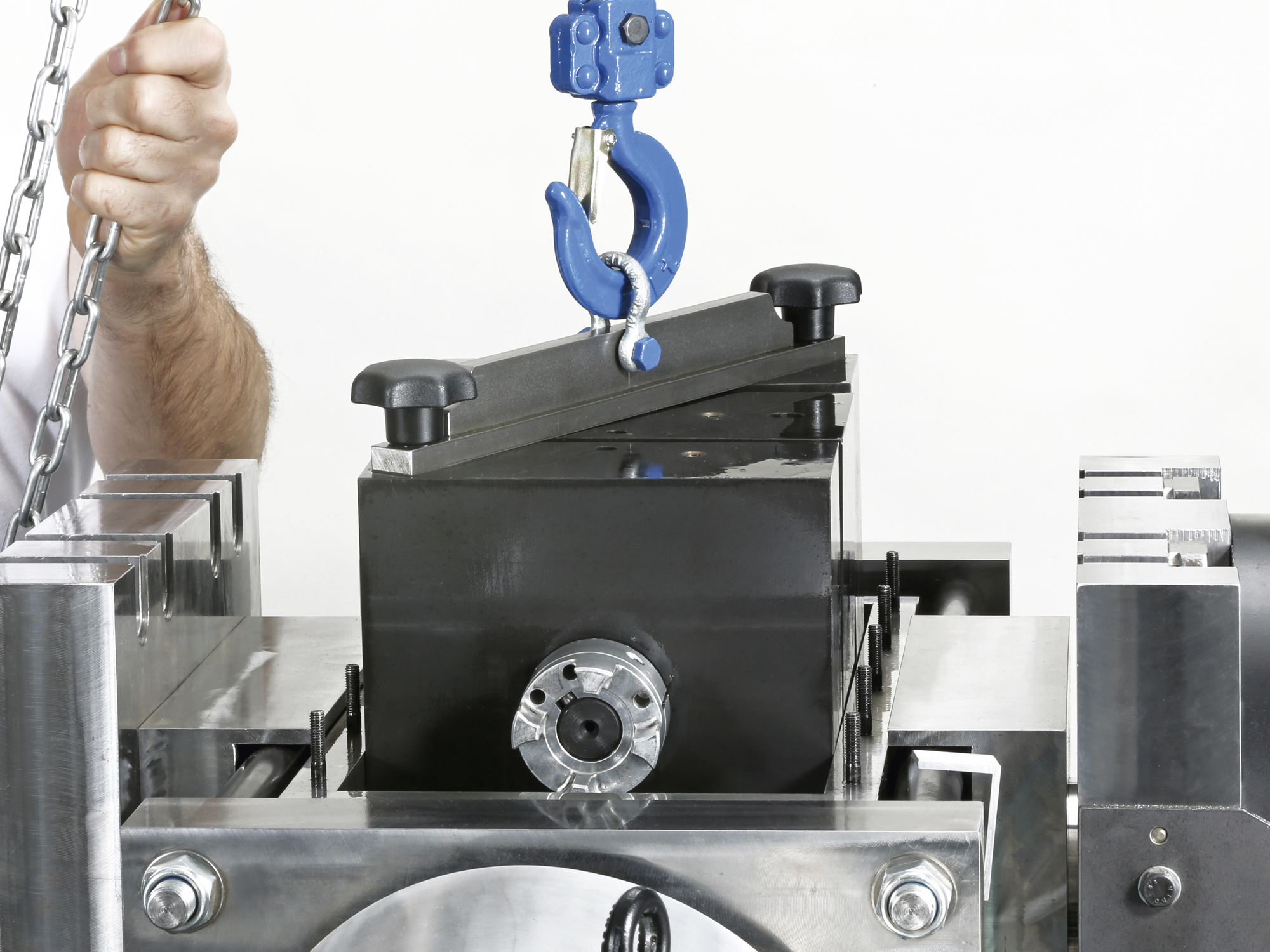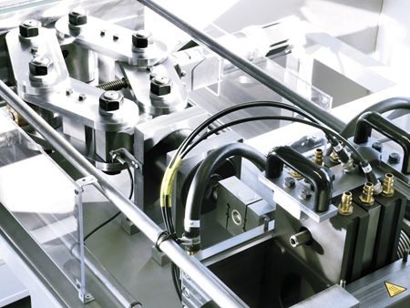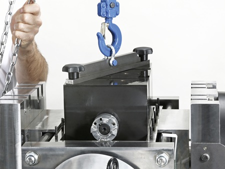 Bei den verwendeten kleinen Rillenkugellagern müssen Radiallasten zwischen 300 N und maximal 20.000 N aufgebracht werden. Für diese Bandbreite mit geringen Abweichungen im Betrieb kam daher kein Hydraulikzylinder infrage. Die präzise Belastung der Radiallager wird bei dem Wälzlagerprüfstand WRM 1603 mit einem Kniehebel bewirkt. Über die permanente Erfassung der Kraft mittels Kraftmessdose stellt ein Schrittmotor die Position des Kniehebels hochgenau nach, sodass die Radialkraft nahezu konstant gehalten wird.